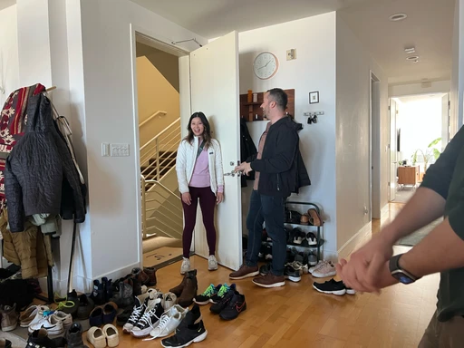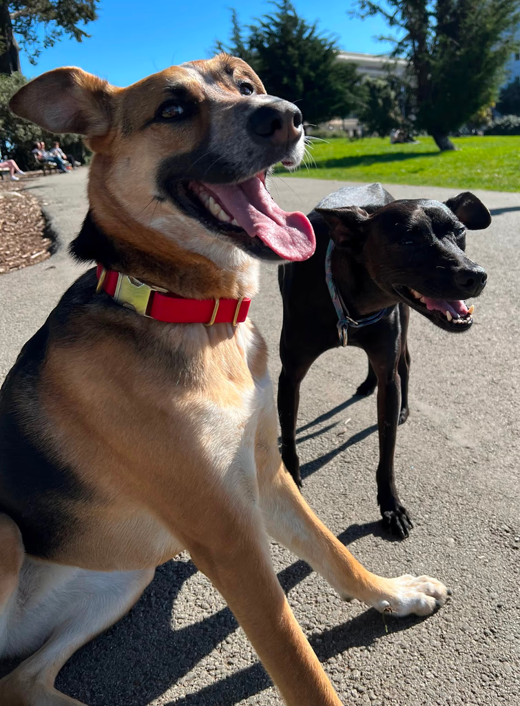 Noah and Vina can always find ways to laugh so hard it’s basically exercise. They also have a silly dog, Izzy, who will be at the next stop. Noah adopted Izzy during the pandemic, when available dogs were hard to find. Noah got really lucky because there is an organization in San Francisco named HARA (Happiness Animal Rescue Alliance) that helps find international dogs homes in America. Izzy is a Formosan Mountain dog and was born in a shelter in Taiwan. Black dogs are particularly hard to place with families because they don’t photograph as well and tend to be overlooked. But when Noah saw Izzy he knew he had to adopt her.