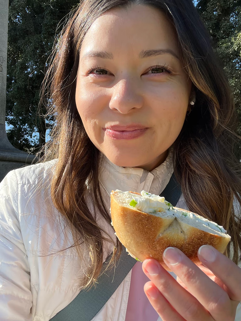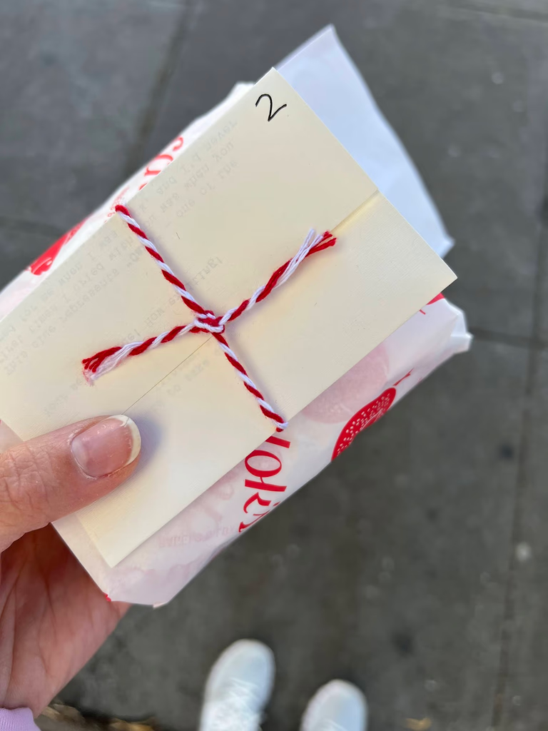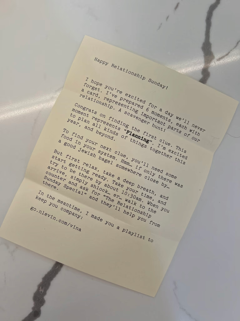 Schlok’s is Noah and Vina’s favorite bagel joint and is just a few blocks down the street from where they live. Vina continued to listen to the curated playlist on the Schlok walk and arrived just before 10:30am. Vina asked for the “Relationship Sunday Special.” The woman behind the counter replied with a big smile and handed over a salt bagel with chive cream cheese (Vina’s regular order) with clue # 2.