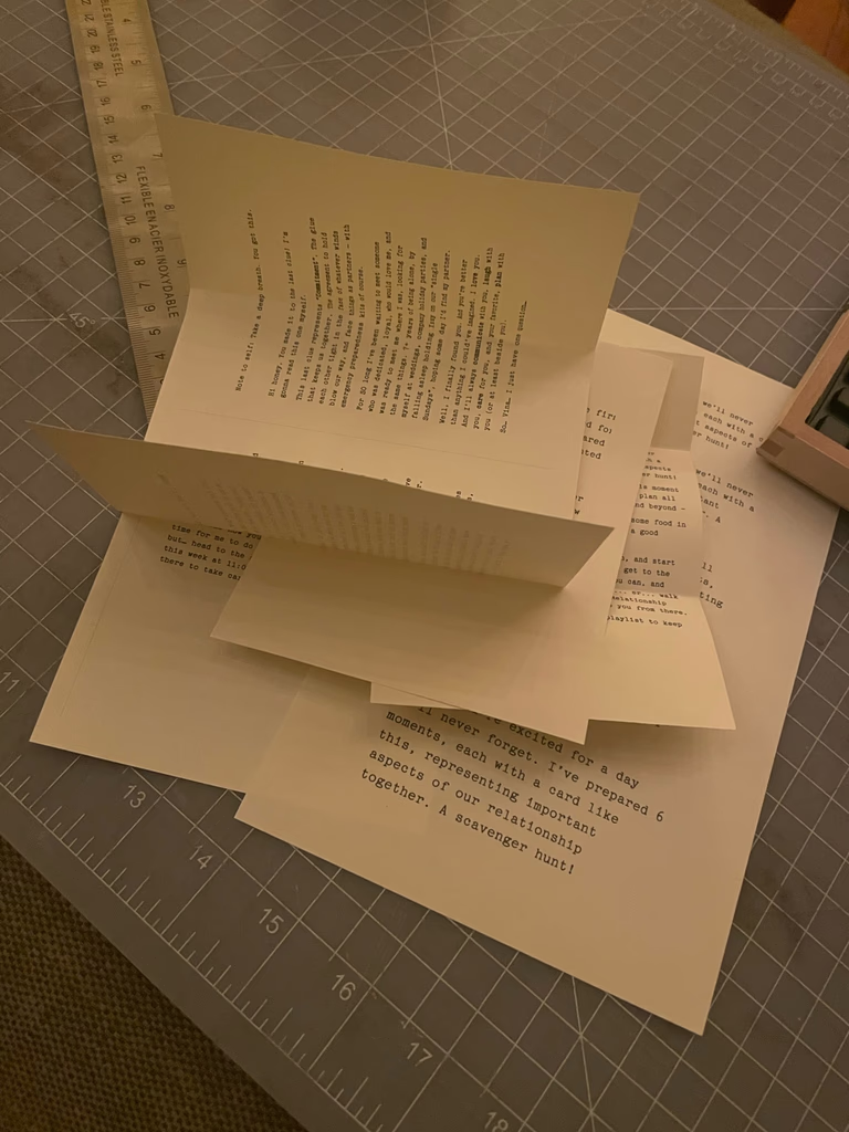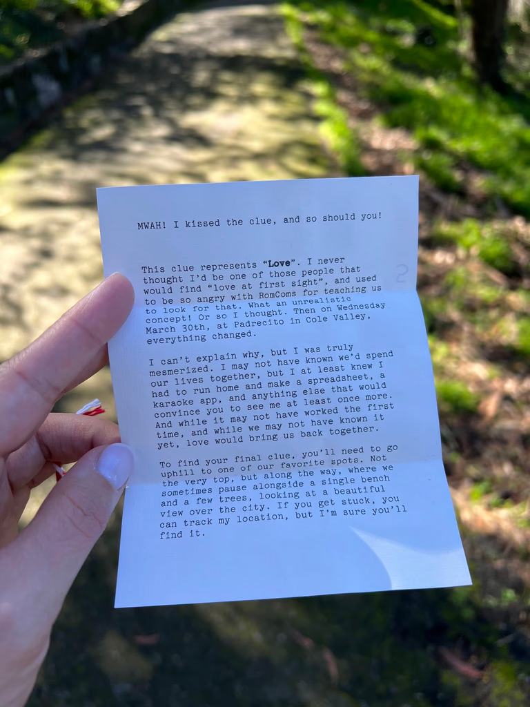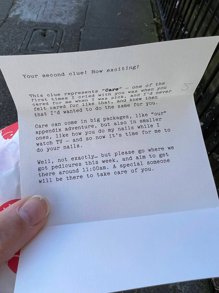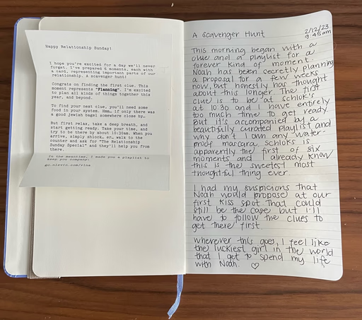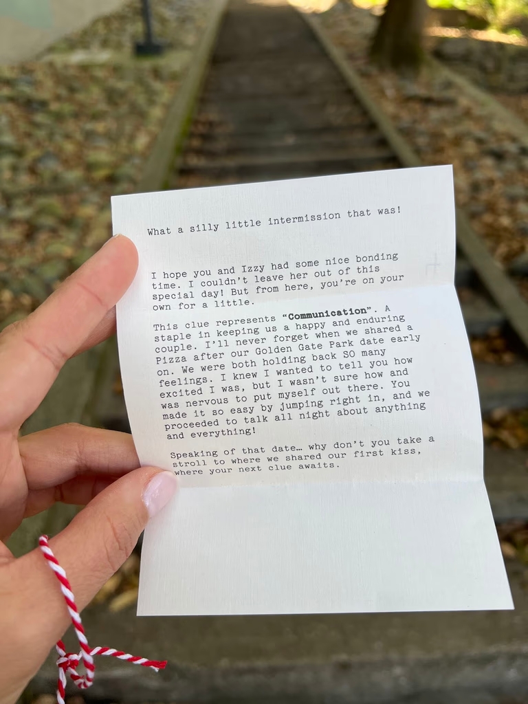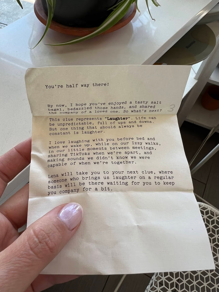 Noah said he was going to walk Izzy and call his best friend Max. Vina stayed behind in bed. Shortly after, Noah texted “did I leave my airpods on the bar?” There were no airpods on the bar, but there was the first clue to a scavenger hunt. Upon opening, she knew this meant it would end with a proposal.