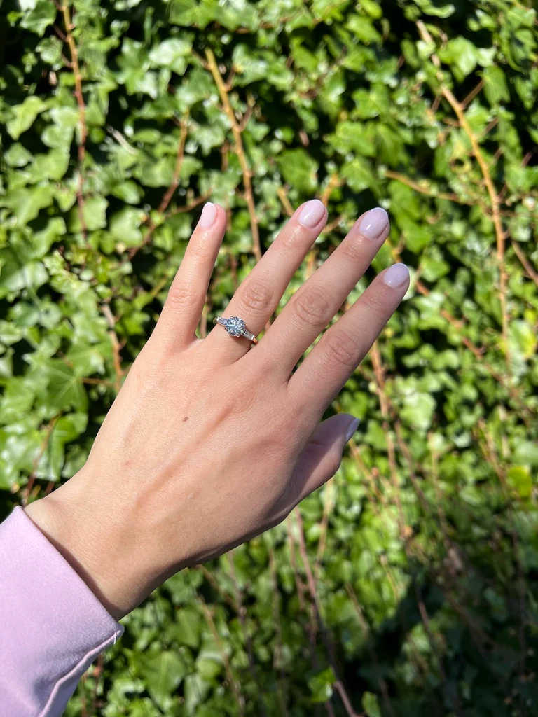 Even the ring has a sentimental backstory. The center diamond was passed on from Noah’s mother, Karen. Noah’s late father, Harry, chose this diamond for Karen’s engagement ring in a solitaire setting with a gold band. Henne Jewelers in Pittsburgh procured the old European cut diamond from an estate sale. This particular cut was popular between 1910s-1930s and is known to have a great fire, which refers to the multi-colored flashes of color that come from within the diamond.