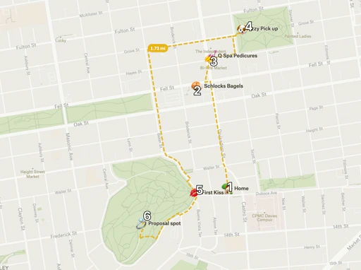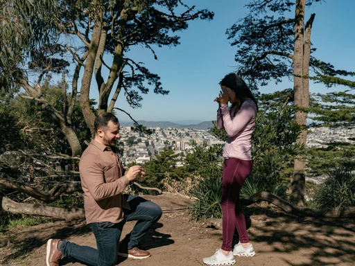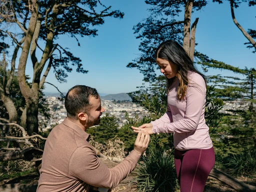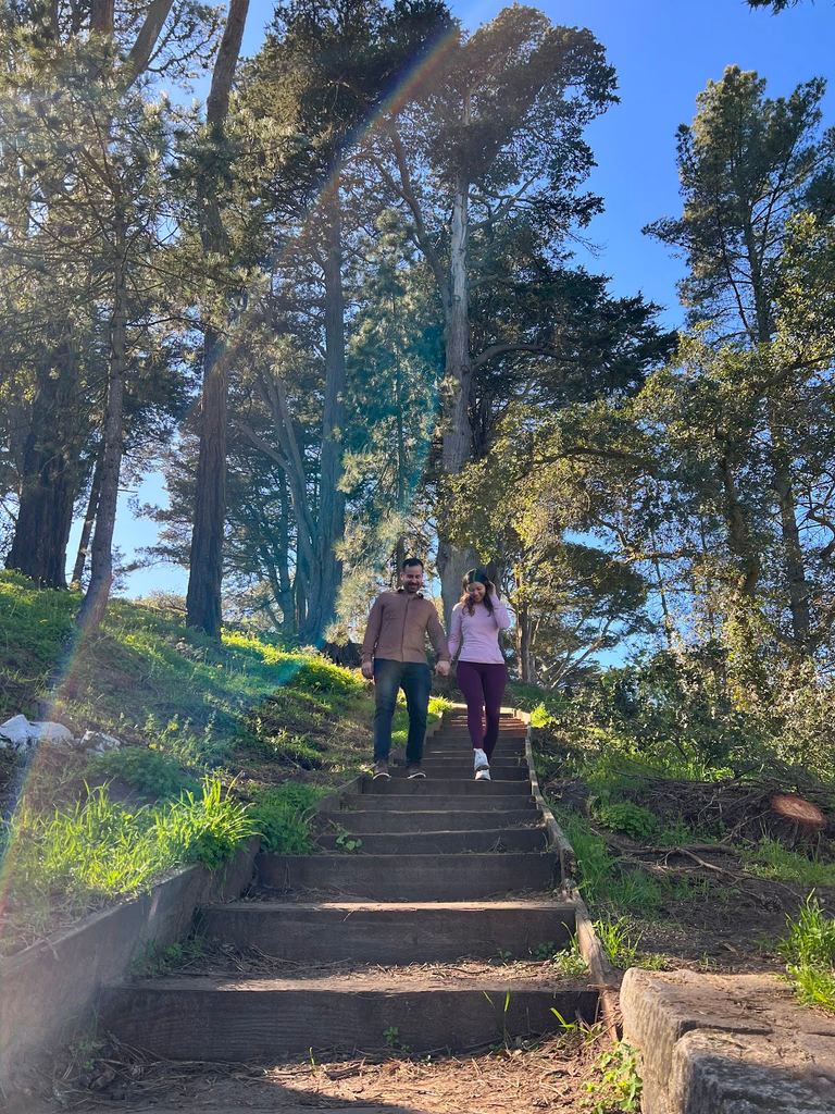 Noah and Vina had fallen in love quickly. Noah even earlier than Vina but she caught up. After their first date, Noah had made her a spreadsheet and Karaoke app and she still wasn’t convinced that he was “that interested.” It wasn’t until months later on that date that stretched from Golden Gate Park to Buena Vista Park date that the feelings freely came out. Since then, they had brought Izzy to Buena Vista Park pretty often, it’s just a few blocks uphill from where they both now live (Vina moved into Noah’s place recently). Now Vina was headed to locate the bench that Noah once subtly hinted at being a nice view on one of their walks, knowing it would be the backdrop of their proposal.